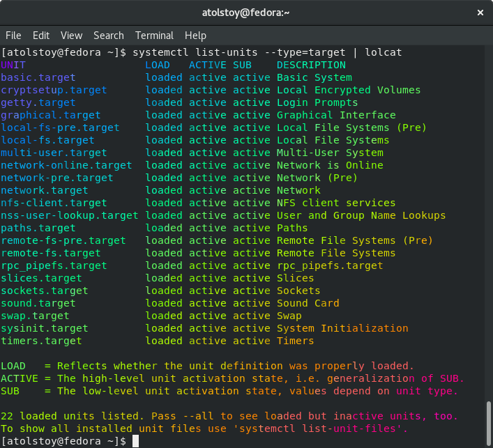 再说一次,使用 lolcat 命令管道任何其他命令,并在 Fedora 终端中享受彩虹(和独角兽!)。