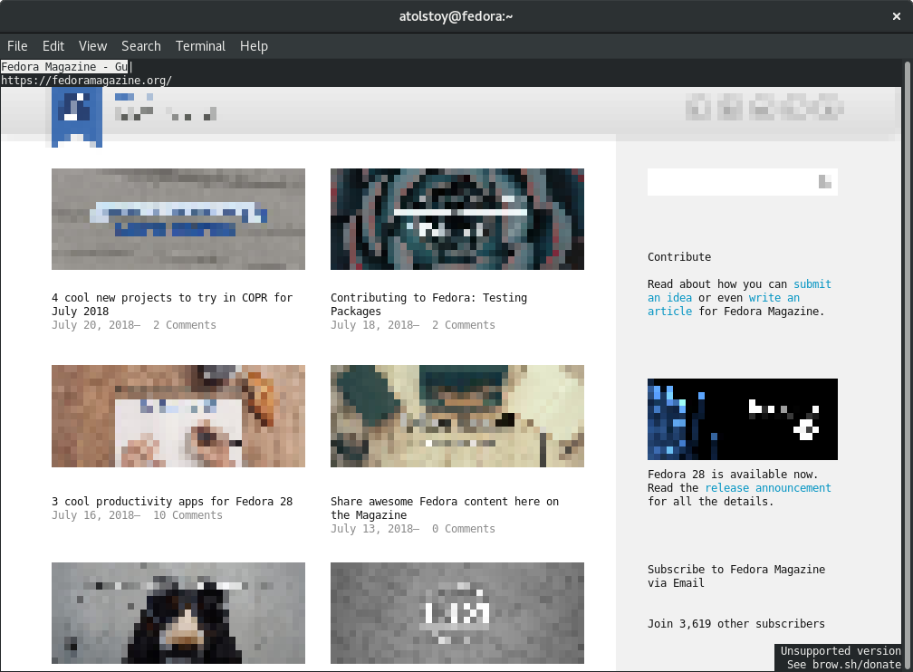 Browsh 是完善的终端网页浏览器。它比 Lynx 更强大,当然更引人注目。 Browsh 以无头模式启动 Firefox Web 浏览器(因此你无法看到它)并在特殊 Web 扩展的帮助下将其与你的终端连接。因此,Browsh 能像 Firefox 一样呈现所有富媒体内容,只是有点像素化的风格。