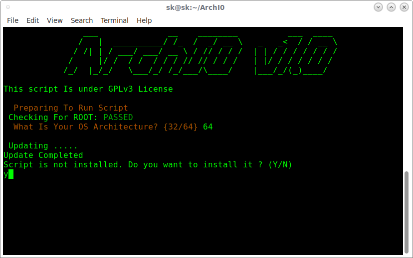 输入你的 Arch Linux 系统架构然后按回车键。当其请求安装此脚本时,键入 y 然后按回车键。