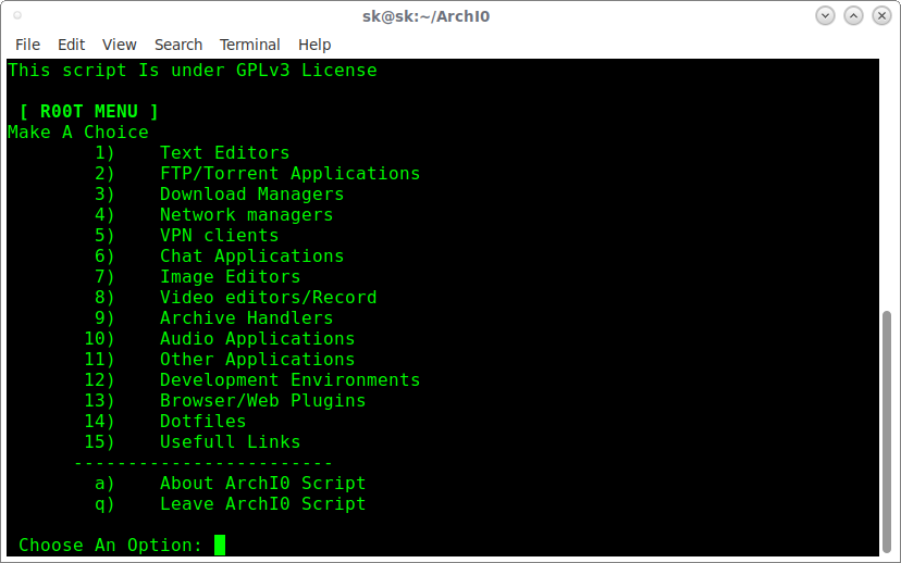 正如前面的截图, ArchI0 包含有 13 类、90 个容易安装的程序。这 90 个程序刚好足够配置一个完整的 Arch Linux 桌面,可执行日常活动。键入 a 可查看关于此脚本的信息,键入 q 可退出此脚本。