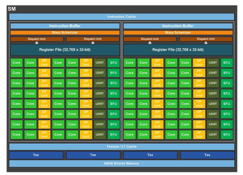 每个块都包含如下组件:一组核心、一个 调度器 scheduler 、一个 寄存器文件 register file 、指令缓存、纹理和 L1 缓存以及纹理 映射单元 mapping unit 。SM/CU 可以被认为是 GPU 中最小的可工作块。SM/CU 没有涵盖全部的功能单元,例如视频解码引擎,实际在屏幕绘图所需的渲染输出,以及与 板载 onboard 显存 Video Memory (VRAM)通信相关的 内存接口 memory interfaces 都不在 SM/CU 的范围内;但当 AMD 提到一个 APU 拥有 8 或 11 个 Vega 计算单元时,所指的是(等价的) 硅晶块 block of silicon 数目。如果你查看任意一款 GPU 的模块设计图,你会发现图中 SM/CU 是反复出现很多次的部分。