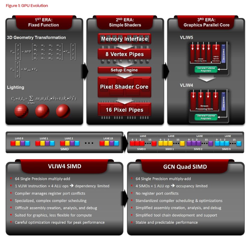 GPU 是一种包含一系列专用硬件特性的设备,其中这些特性可以让各种 3D 引擎更好地执行代码,包括 形状构建 geometry setup ,纹理映射, 访存 memory access 和 着色器 shaders 等。3D 引擎的功能特性影响着设计者如何设计 GPU。可能有人还记得,AMD HD5000 系列使用 VLIW5 架构 archtecture ;但在更高端的 HD 6000 系列中使用了 VLIW4 架构。通过 GCN (LCTT 译注:GCN 是 Graphics Core Next 的缩写,字面意思是“下一代图形核心”,既是若干代微体系结构的代号,也是指令集的名称),AMD 改变了并行化的实现方法,提高了每个时钟周期的有效性能。